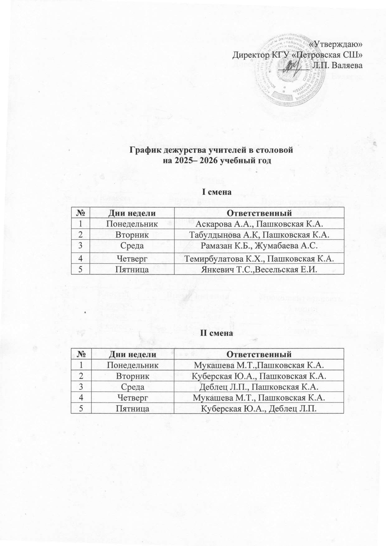 График дежурства учителей в столовой на 2025-2026 учебный год — КГУ «Петровская средняя школа» КГУ «Отдел образования Тайыншинского района»