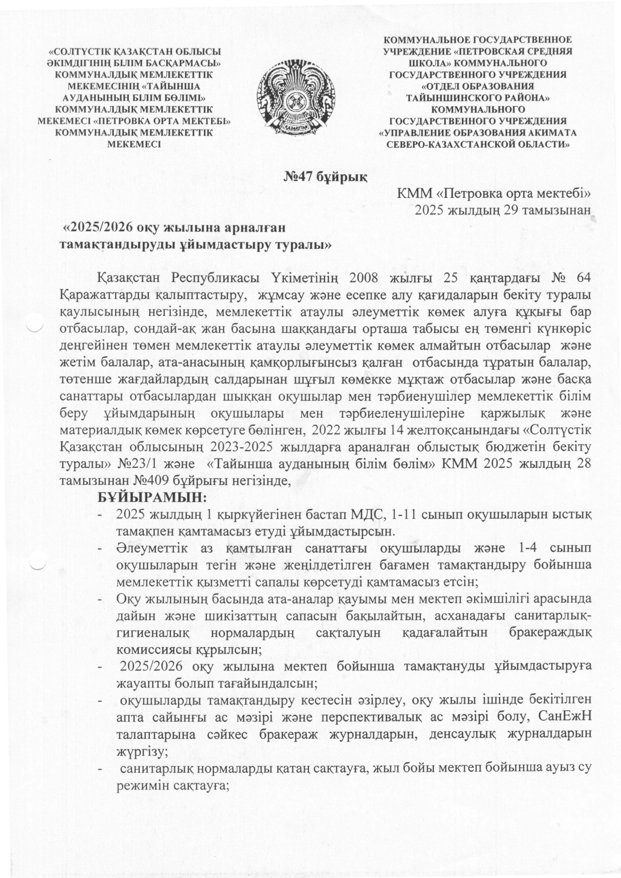 «Мектепке ыстық тамақ тәртібін ұйымдастыру туралы» — «Тайынша ауданының білім бөлімі» КММ «Петровка орта мектебі» КММ