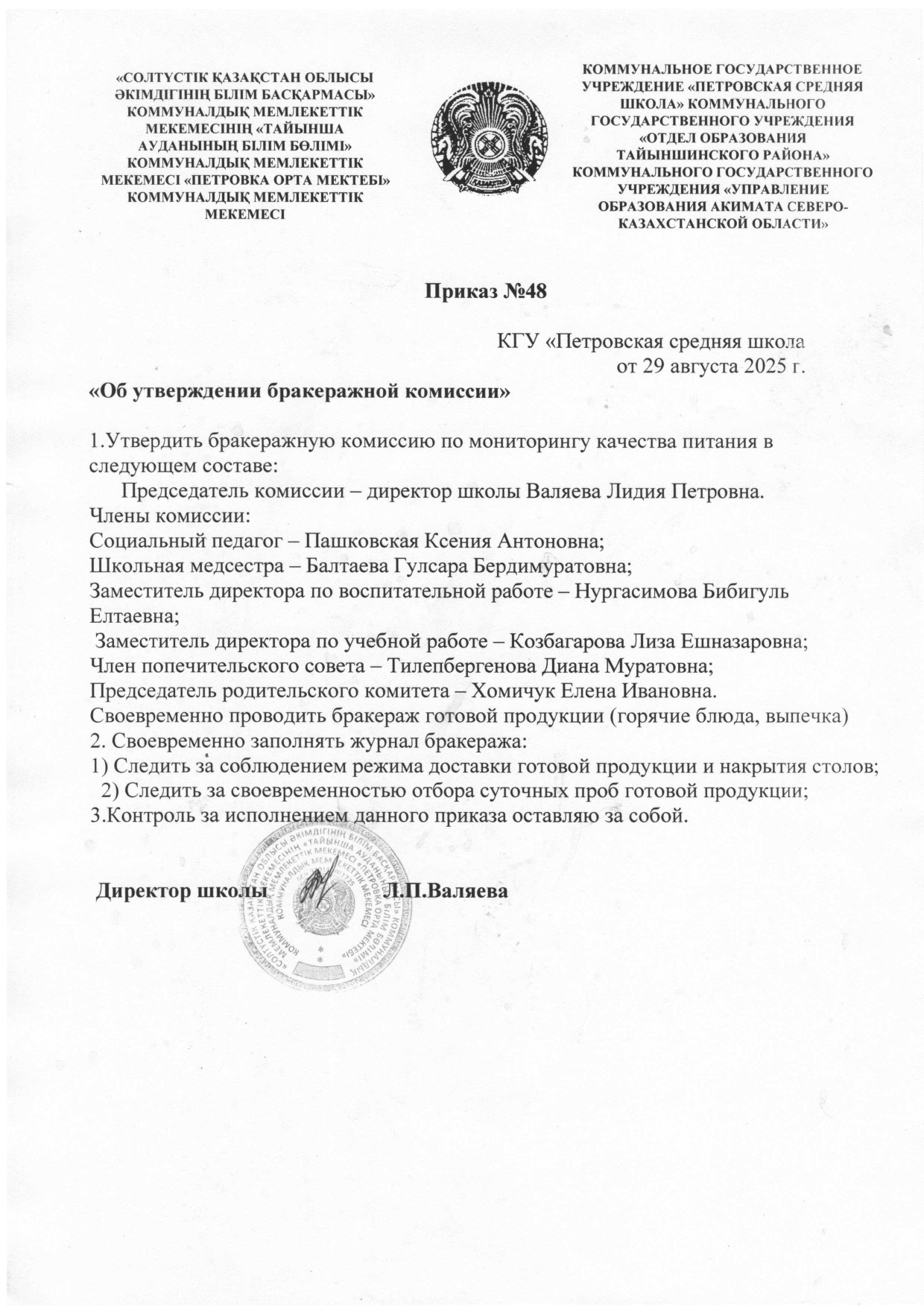 Приказ бракеражной комиссий — КГУ «Петровская средняя школа» КГУ «Отдел образования Тайыншинского района»