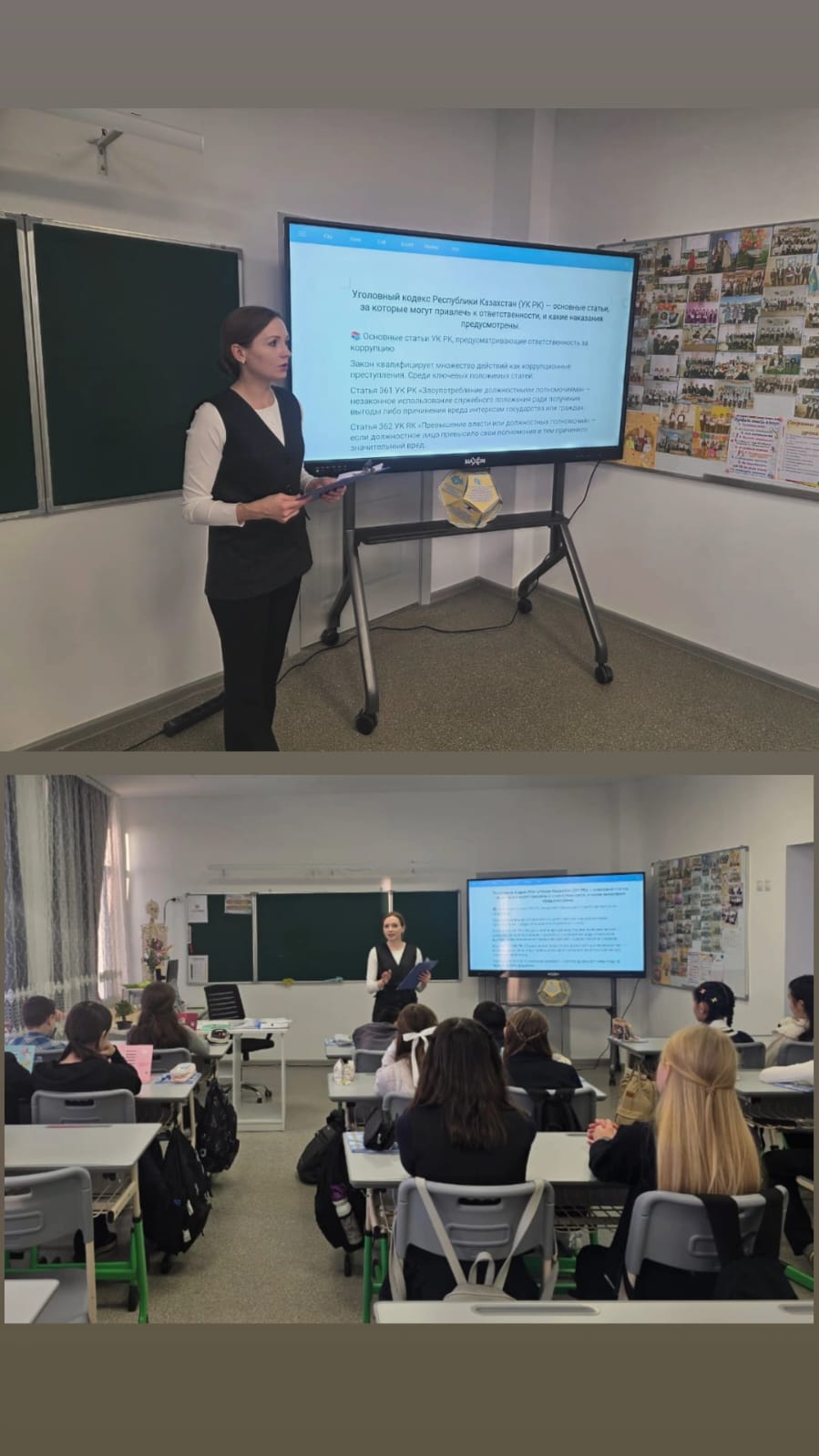 Проведена разъяснительная беседа с учащимися по статьям законодательства Республики Казахстан, касающимся вопросов коррупции и недопустимости её проявлений.